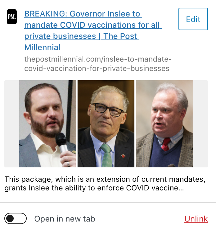 Mandate to be imposed on employees of small businesses 26Oct 202113 Jan 2022 Told ya. Inslee to impose mandate on ALL employees even small businesses. Social Media Click to share on X (Opens in new window) X Click to share on Facebook (Opens in new window) Facebook Click to share on Reddit (Opens in new window) Reddit Click to email a link to a friend (Opens in new window) Email Like Loading...