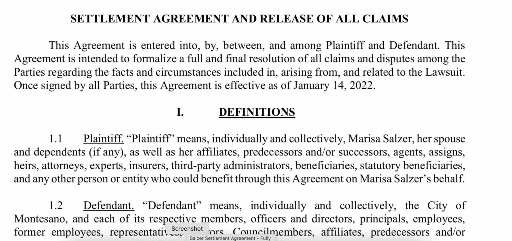 The suit was filed against the City of Montesano. WEB ARTICLE. Followed up with charges of retaliation against Marisa by the city. The dance began.