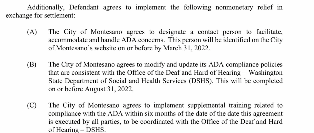There is also a list of things that Marisa wanted in regard to deaf services for the entire community as it concerns access. Some she got, some she did not get as part of the settlement. They are important issues to address and I am not qualified to speak to them or their ramifications. I have reached out to people that are and will do a follow up as it becomes more clear. I have also reached out to Marisa directly and invited a written essay on disability access as it relates to the public.