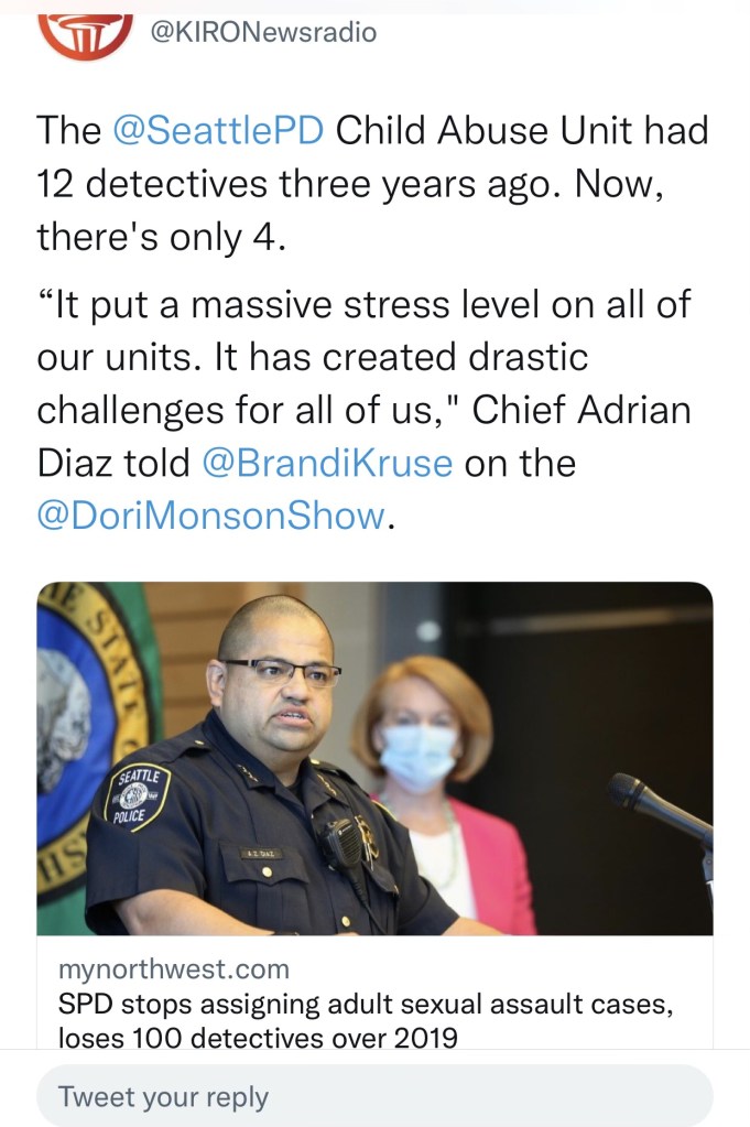 Child sexual assault is the canary in the coal mine. When there aren’t even enough police to investigate child abuse……..it is all over. There isn’t anyone home. It is open season on abusing children in the city of Seattle. And don’t think the word isn’t out.